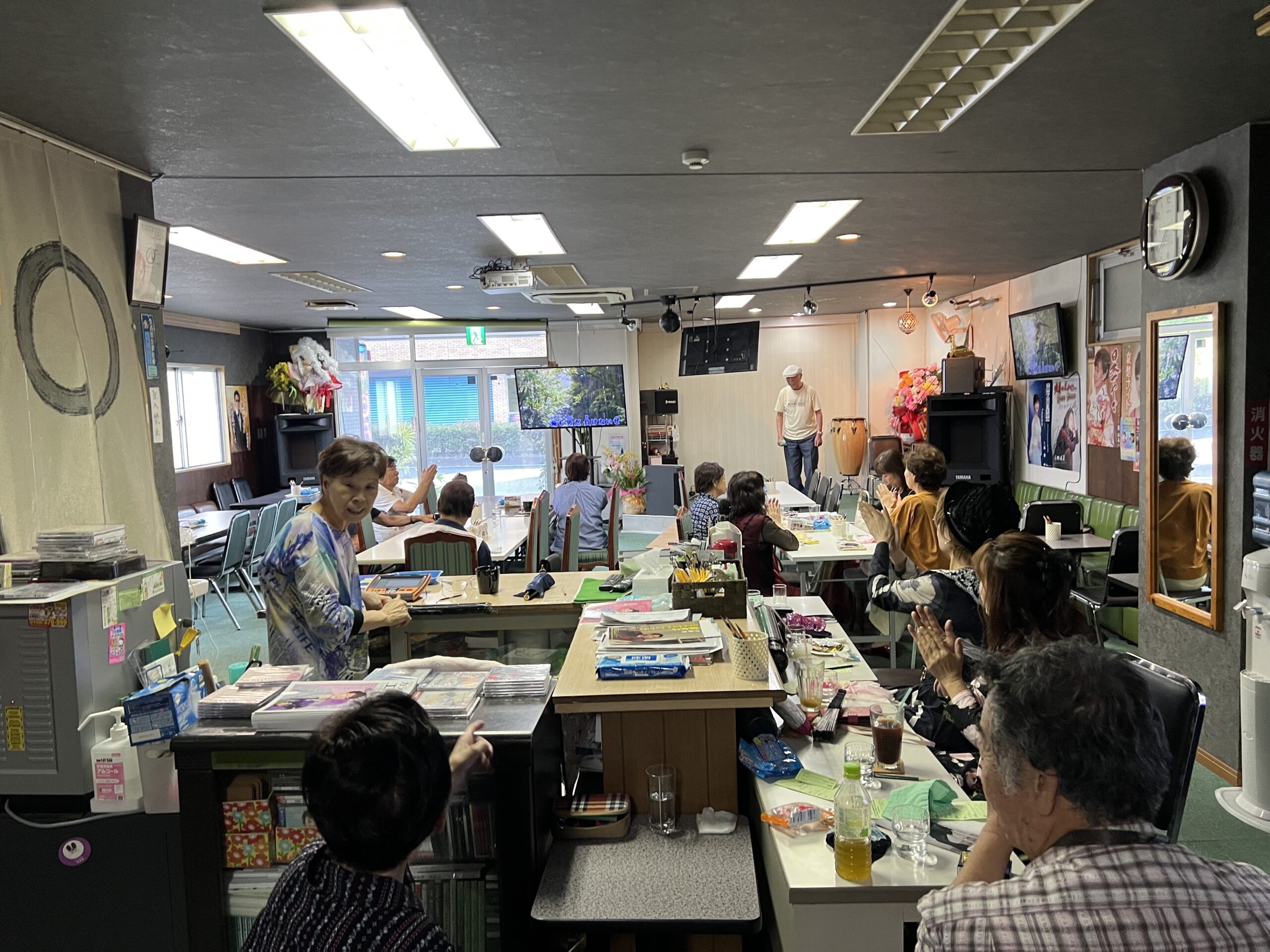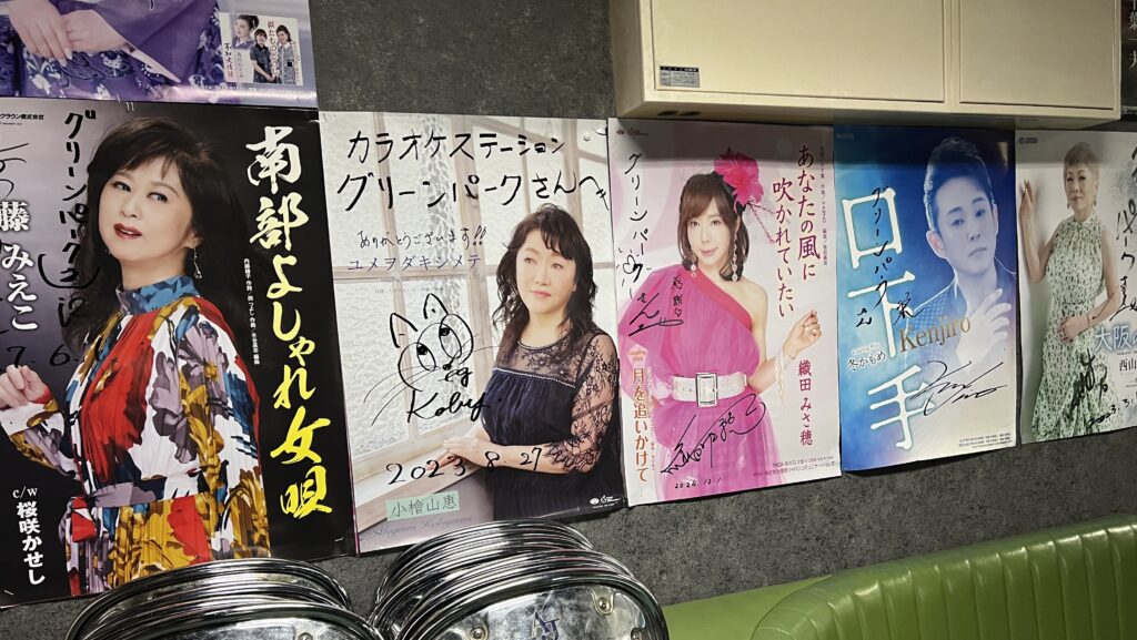 ここはママさんの人徳かプロの歌手がよく訪れます。店内にはたくさんのポシターが貼ってあります。店内はとても広く80名くらい収容できイベントするには好都合です。