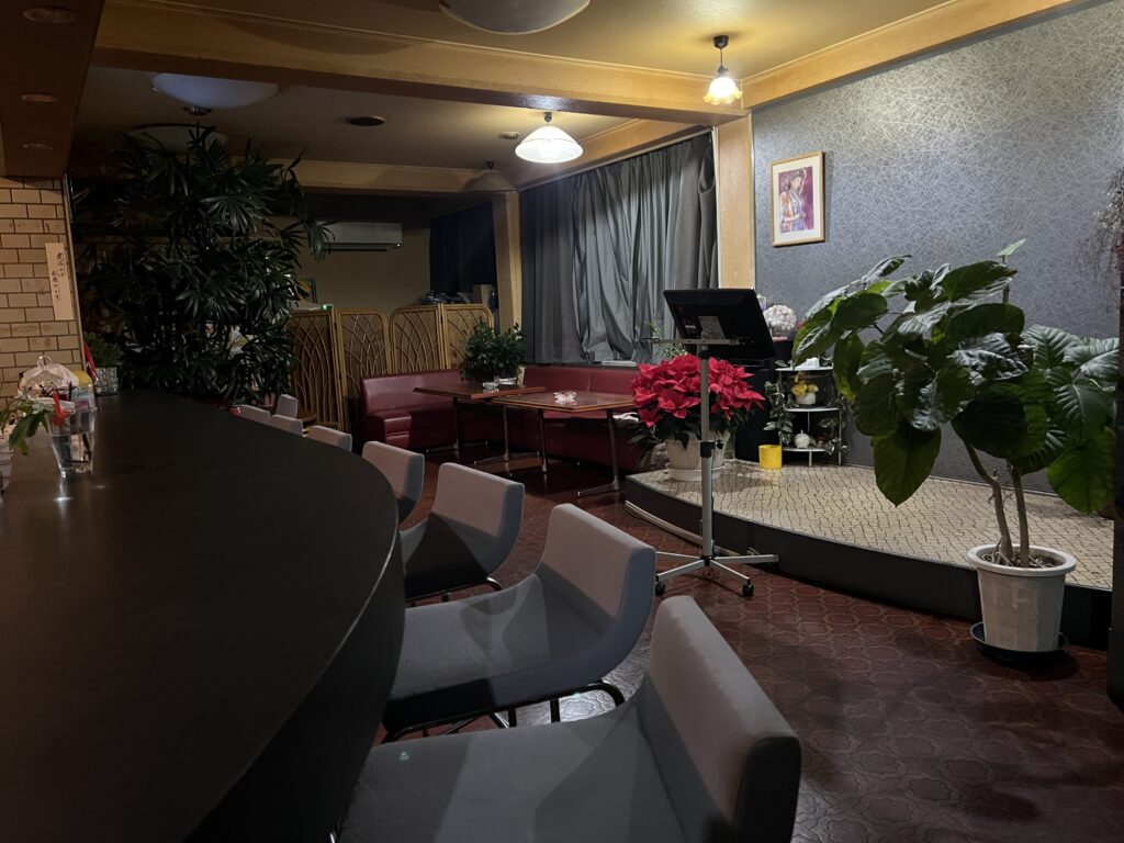 いつもはカウンター席から満員になりBOX席も充実しているので多数の来店でも大丈夫、カラオケはBOX席で歌うもよし、ステージで歌うことも可。