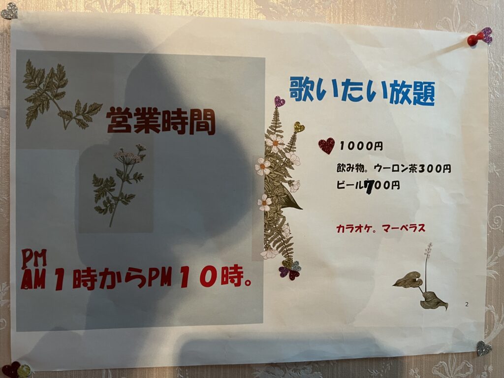 営業時間が遅くまでという事で昼間の時間帯は年配者、夜は昼間よりも若干、若い人が集まるようです。「カラオケBAR」として営業している店で、1,000〜2,000円程度の価格帯です。
